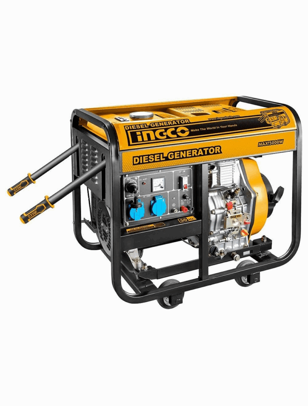 El generador diésel INGCO GDE50001 ofrece potencia confiable para respaldo eléctrico o uso industrial-ligero, ideal para talleres, obra, servicios de emergencia o ambientes donde se requiere autonomía energética. Ofrece una salida máxima de 5,0 kW y una salida nominal de 4,5 kW con voltaje 220-240 V en fase simple y frecuencia de 50 Hz. Funciona con un motor diésel de 9 HP (418 ml de cilindrada) refrigerado por aire, girando a 3 000 rpm. Incorpora inicio eléctrico y también por retroceso, alternador con bobinado de cobre, salida DC de 12 V / 8,3 A, tanque de combustible aproximado de 15-16 litros y peso seco en torno a 102 kg. Viene con ruedas y mango auxiliar para facilitar su transporte.