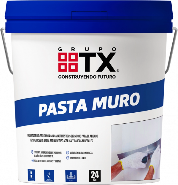 Pasta muro Transex en tineta de 24 kg, formulada para interiores, de fácil aplicación y gran adherencia, ideal para lograr muros lisos y listos para pintar.